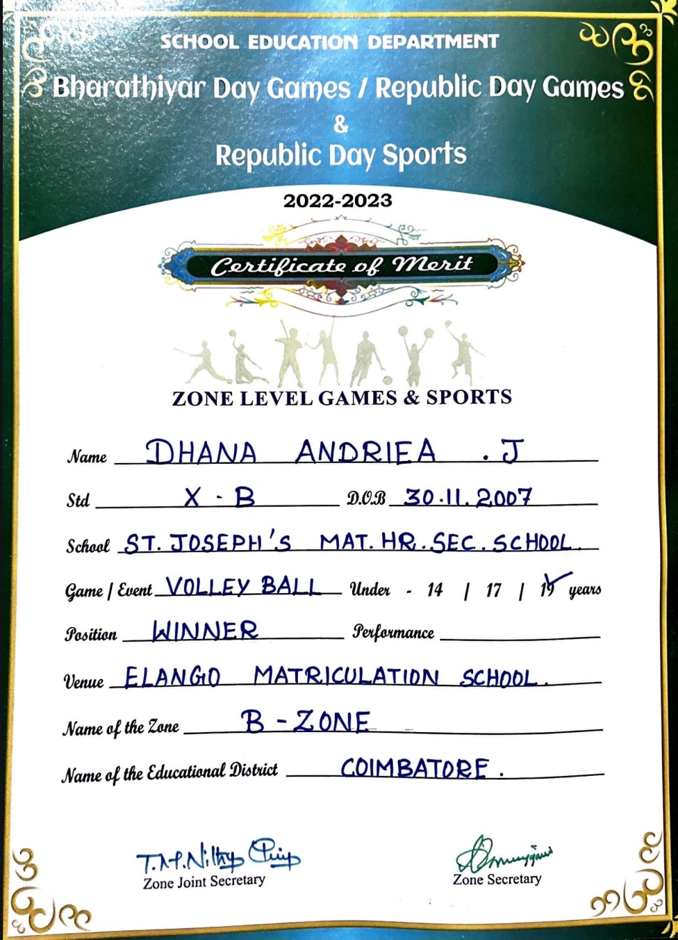 I am J. Dhana Andriea. From my school days, I have always cherished my education, which I consider the foundation of my personal and professional growth. I am currently studying at St. Joseph's Matriculation Higher Secondary School. From LKG to 12th grade, I have been a proud student of the same institution.